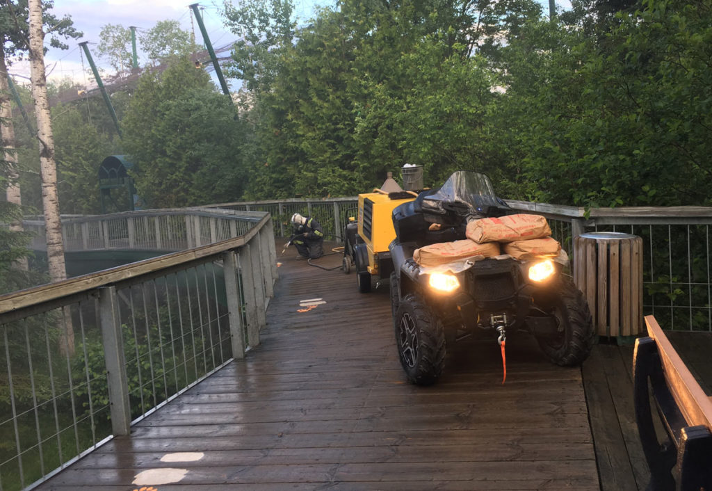 Le Zoo sauvage de St-Felicien a fait lui aussi appel à nos services pour des changements à apporter à ses passerelles. Nous avons retiré les motifs de pattes d’ours qui ornaient le plancher, autant sur les surfaces de bois que d’asphalte, pour par la suite procéder à leur complète restauration.